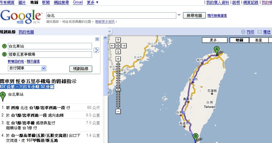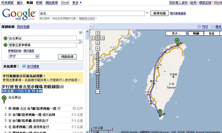 昨天 Google地圖發佈了進階版,貼心的方便我們這些拿著地圖也分辨不出方位的路癡們,他不但有大眾運輸的規劃、自行開車還有走路的路徑規劃,妙的是還有時間與公里數的顯示。