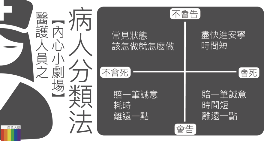 醫護人員之【內心小劇場】病人分類法 On 2019-06-222019-06-22 由Scanol撰寫 只有醫護朋友時,在醫院的一切都理所當然,但在外面的世界,醫護的每一個move都充滿了神秘色彩。 像今天,幾位朋友興致勃勃的問我「檢傷分類」是怎麼分的,我就很誠懇的跟他說了我的病人分類法,這可是一位聰明的急診醫師教我的喔! 大家聽完都十分認同,紛紛覺得我真的是很專業又有實戰經驗的護理人員呢! 分享此文: 點這裡列印(在新視窗中開啟) 列印 相關